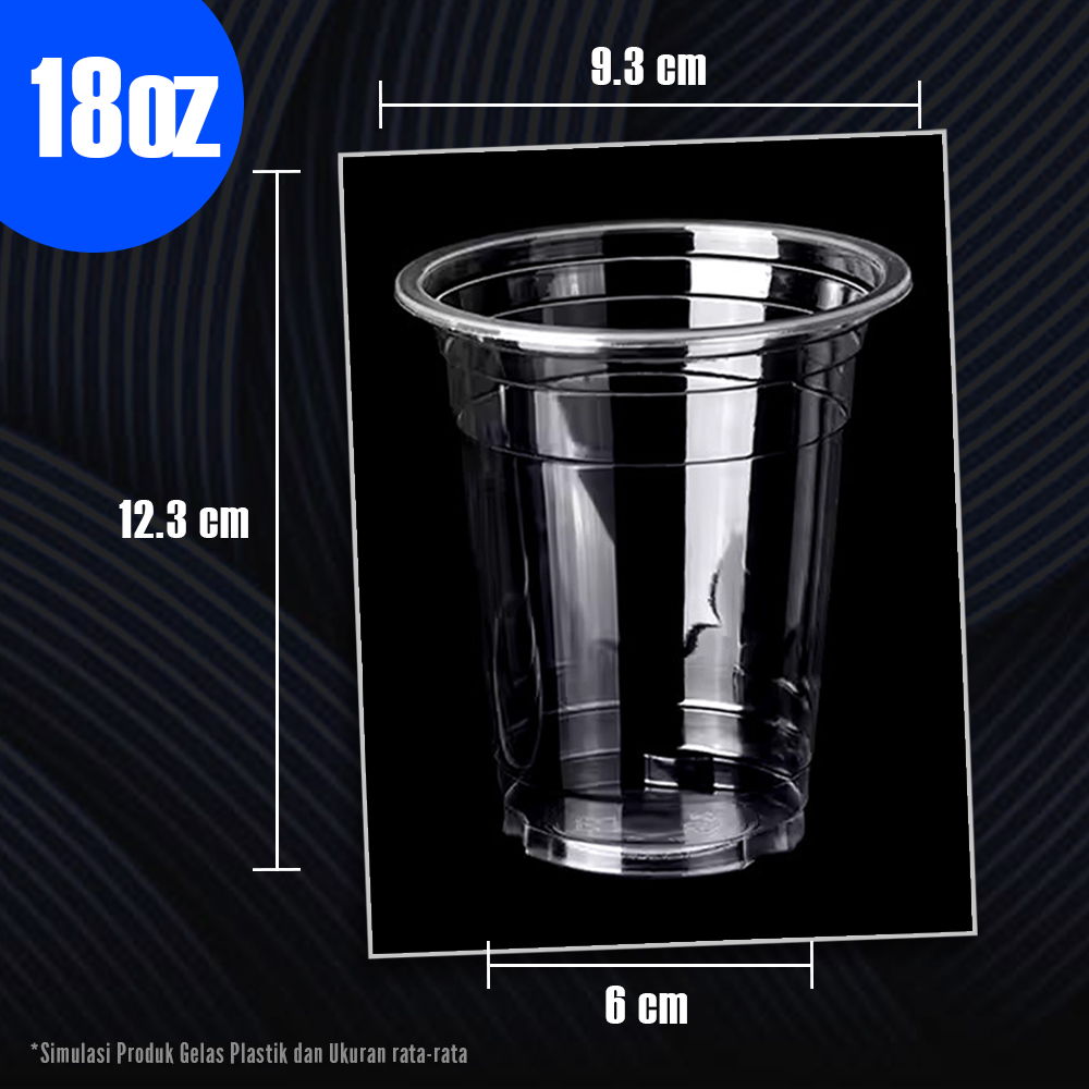 Gelas plastik ukuran 18 Oz untuk minuman dingin seperti es teh, soda, atau jus. Kapasitas 18 Oz (533 ml).
